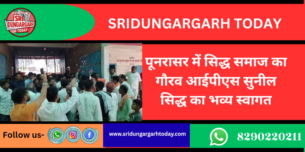 क्षेत्र के गांव बरजांगसर की पावन धरा के सुपुत्र सुनील सिद्ध के भारतीय प्रशासनिक प्रतियोगी परीक्षा में सफलता प्राप्त करने पर मंगलवार को पूनरासर गांव में भव्य स्वागत एवं सम्मान समारोह आयोजित किया गया। ग्रामीणों और सिद्ध समाज के लोगों ने उन्हें माला व साफा पहनाकर सम्मानित किया तथा उज्ज्वल भविष्य के लिए शुभकामनाएं दीं।