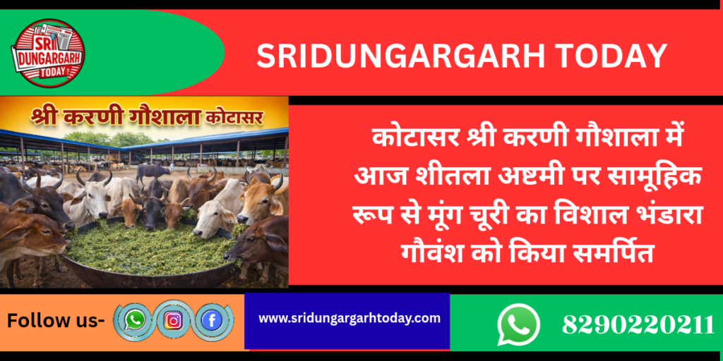 शीतला अष्टमी के पर्व पर आज गौशाला के दानदाताओं ने सामूहिक रूप से गौ माताओं को मुंगचुरी का शीतल भंडारा समर्पित कर शीतला अष्टमी का पर्व मनाया। गौशाला प्रबंधक ने बताया कि गौशाला में प्रत्येक पर्व पर दानदाताओं के द्वारा गौ सेवा लगातार चल रही है। एवं दानदाता भामाशाह अपने जन्म दिवस एवं वैवाहिक वर्षगांठ सहित सभी पर्व गौ सेवा कर ही मानते हैं।