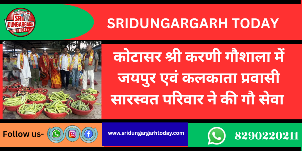 सोमवार को गांव कोटासर की श्री करणी गौशाला में जयपुर प्रवासी रवि कुमार मोट एवं धर्मपत्नी सुमन देवी मोट सारस्वत नवलगढ़ अपने सुपुत्र मनन के साथ पहली बार गौशाला पधारकर गौशाला का भ्रमण किया दस दौरान गौशाला के भामाशाह कोलकाता प्रवासी हरिकिशन सारस्वत खारड़ा हाल बीकानेर,कोलकाता प्रवासी शिवरतन सारस्वत हेमासर,भागीरथ ओझा दुलचासर एवं धर्मपत्नी भी साथ रहे। सभी ने सामूहिक रूप से गौशाला की गौ माताओं को हरि फल सब्जी एवं शीतल मिठे तरबूज गौ माताओं को समर्पित कर गौ सेवा का सौभाग्य प्राप्त किया। गौशाला प्रबंधक ने बताया कि सारस्वत परिवार समर्पित भाव से गौशाला से जुड़ा है अनवरत गौ सेवा चल रही है गौशाला कमेटी ने पधारे हुए सभी दानदाताओं को स्मृति चिन्ह भेंट कर एंव दुप्पटा पहनाकर कर सम्मान करते हुए आभार जताया