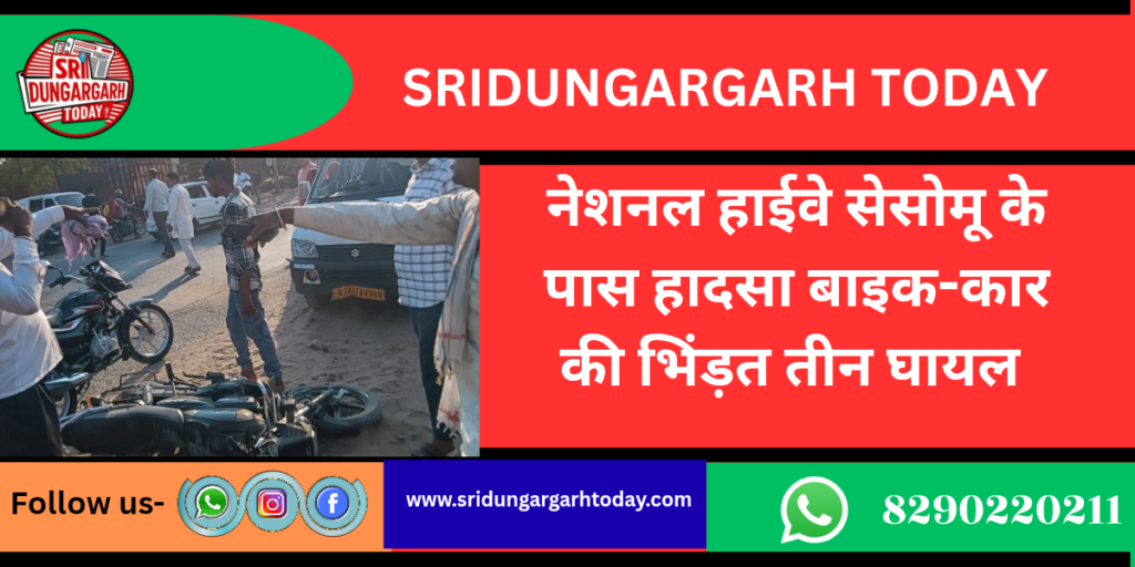 श्रीडूंगरगढ़ NH.11 सेसुमों स्कूल के सामने कार और बाइक की टक्कर भिंड़त हो गई। जिसमे बाइक सवार तीन जने घायल हो गए। सूचना मिलते ही डॉ एपीजे अब्दुल कलाम टीम एंबुलेंस लेकर मौके पर पहुंची और घायलों को तुरंत उपजिला अस्पताल पहुंचाया जहां प्राथिमक उपचार जारी है।घायलों की पहचान 18 वर्षीय हरीश पुत्र चुनीलाल सांसी निवासी कालू बास,33 वर्षीय हेमाराम पुत्र मंगलाराम निवासी लखासर, 42 वर्षीय केशुराम पुत्र लूणाराम निवासी से शेरेरा के रूप में हुई। मिली जानकारी के अनुसार कार बीकानेर की तरफ से आ रही थीं बाइक बीकानेर की तरफ जा रही थी