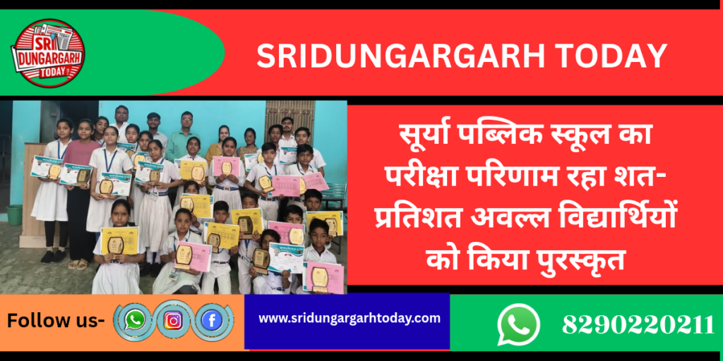 कस्बे के बिग्गाबास स्थित सूर्या पब्लिक स्कूल में परीक्षा परिणाम शत प्रतिशत रहने पर गुरुवार को विद्यार्थियों को पुरस्कृत किया गया। संस्था प्रधान मूलचंद स्वामी ने बताया कि सत्र 2025-26 में गृह परीक्षा एवं बोर्ड परीक्षाओं का परीक्षा परिणाम शानदार शत प्रतिशत रहा।परीक्षा परिणाम में अव्वल रहने वाले प्रथम तीन स्थानों के विद्यार्थियों को प्रशस्ति पत्र एवं प्रतीक चिन्ह प्रदान कर सम्मानित किया गया।इस दौरान शाला के शिक्षक दिलीप कुमार मीणा, नदीम चेजारा, बाबूलाल स्वामी, अंकिता प्रजापत, वंदिता स्वामी जगदीश प्रजापत एवं दिव्या स्वामी ने अपना सहयोग प्रदान किया।